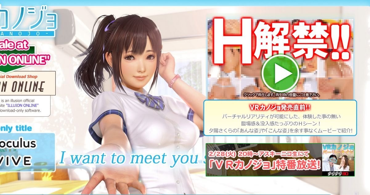 H解禁《VR女友》現已正式開賣!支持正版的時間到了! 2017-02-28 42254 剛剛I社的線上商城正式開賣《VR女友(VR Kanojo)》,售價為4980日元,看在是I社出品的份上這個價格還在大家的承受範圍之內! 另外,今天I社還將公布《VR女友》的突破18禁的新影片,今晚還將放出遊戲製作人親自試玩這款遊戲的影片!有興趣的朋友可以到官網解禁解禁,不過18歲以上限定! Advertisement