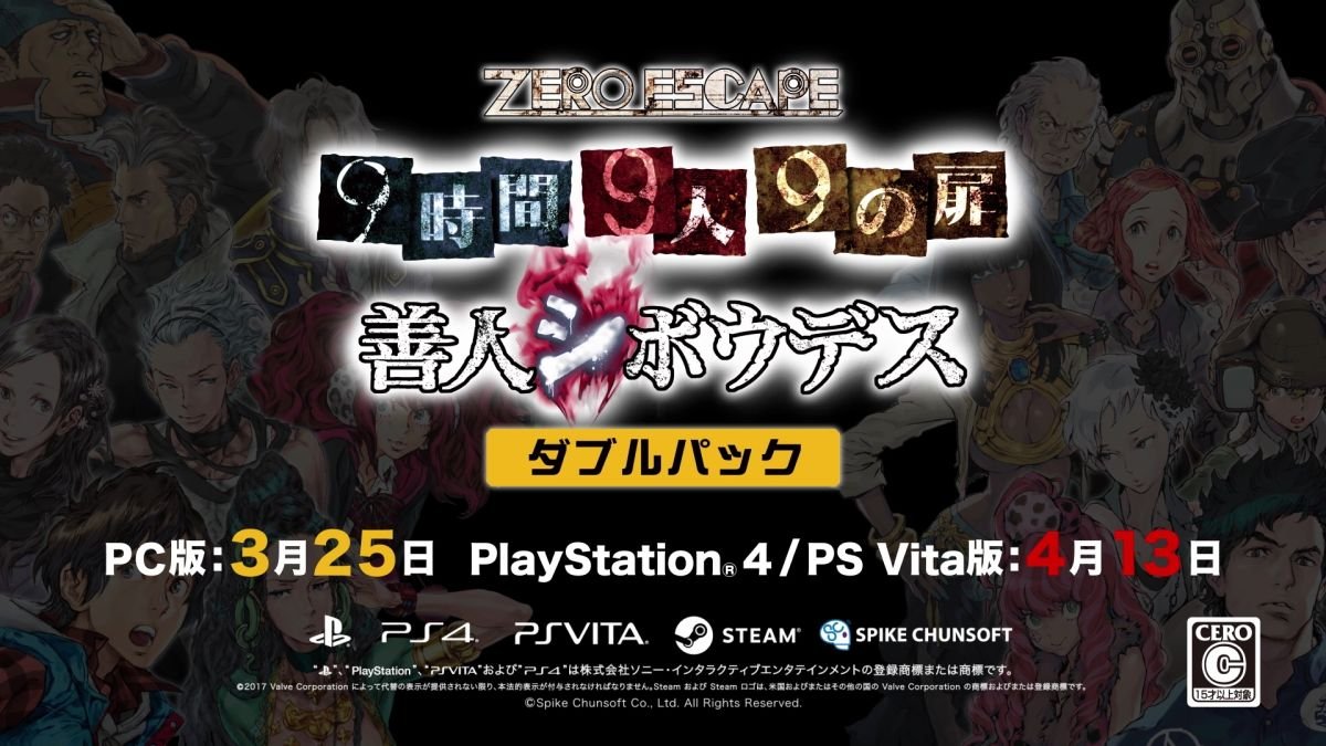 《極限脫出 9小時9人9扇門 善人死亡》是由NDS的《極限脫出 9小時9人9扇門》和PSV及3DS的《極限脫出ADV 善人死亡》組合的遊戲。遊戲中玩家會玩到這兩方的遊戲故事,同時遊戲中玩家將可以重新體驗到這兩款遊戲故事的感覺。遊戲PC版預定3月25日發售,而PS4版及PSV版預定4月13日發售,有興趣的玩家就不要錯過了。