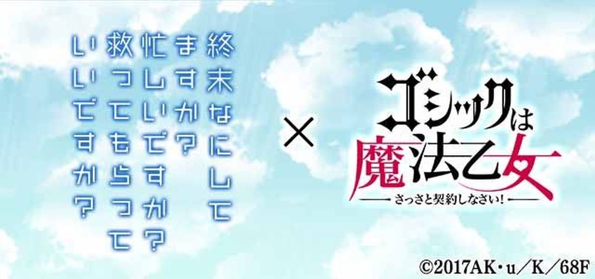 《哥德系魔法少女》(ゴシックは魔法乙女)是一款和少女們進行契約並和她們一起從惡魔手上搶回世界!遊戲只需要滑動畫面就操作到角色的行動。今次遊戲和動畫《末日時在做什麼?有沒有空?可以來拯救嗎?》的合作內容暫時未公佈,而合作時間在6月21日開始!