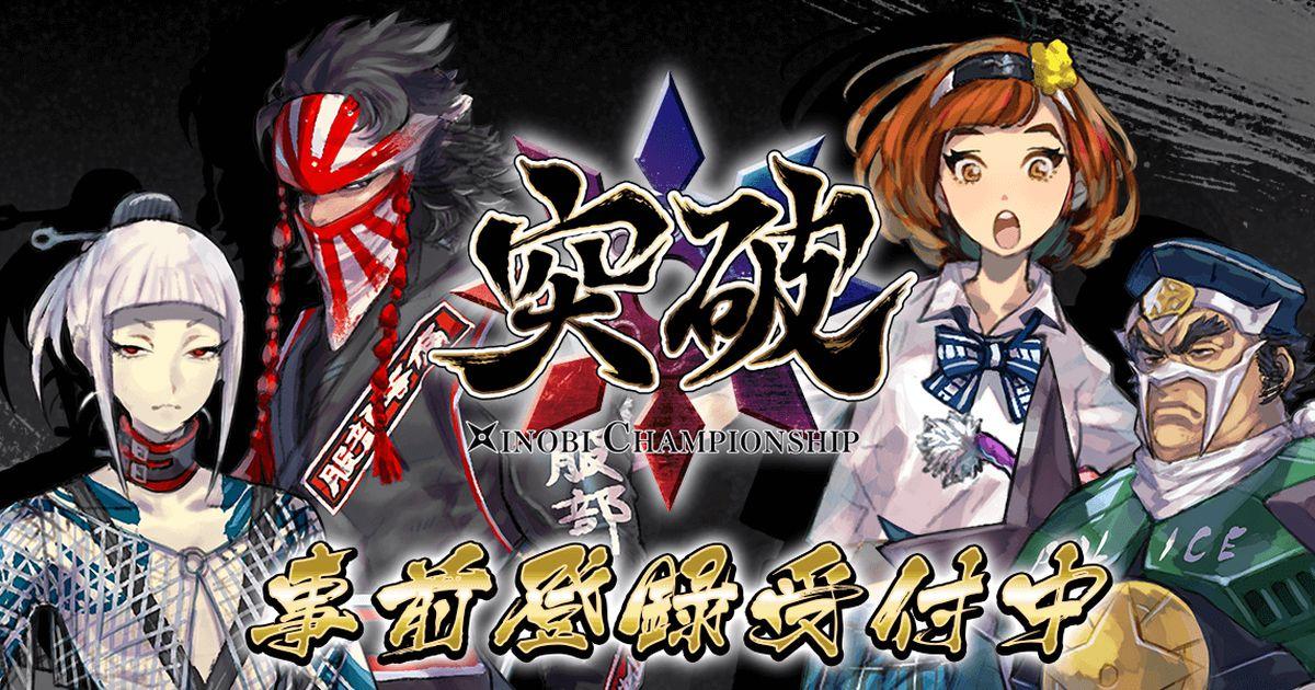《突破 Xinobi Championship》是一款以忍者為主題的對戰卡牌手遊,遊戲中的卡牌角色都是忍者!玩家將會把這一些忍者放到卡組中召喚到場地以同時回合制的方式戰鬥,玩家即會以忍者的眼明手快放出手牌和指令卡牌的動作比對手較快而解決對手!遊戲中有著NPC角色給玩家去鍛鍊自己的身手,玩家玩到足夠的練習模式後就可以去玩配對模式進行遊戲並體驗對戰!遊戲會根據進行的事前登錄人數派發不同稀有度的卡牌,有興趣的玩家就不要錯過了!遊戲預定2017年12月7日推出搶先版遊戲,而遊戲預定2018年2月進行配信,有興趣的玩家可以留意!