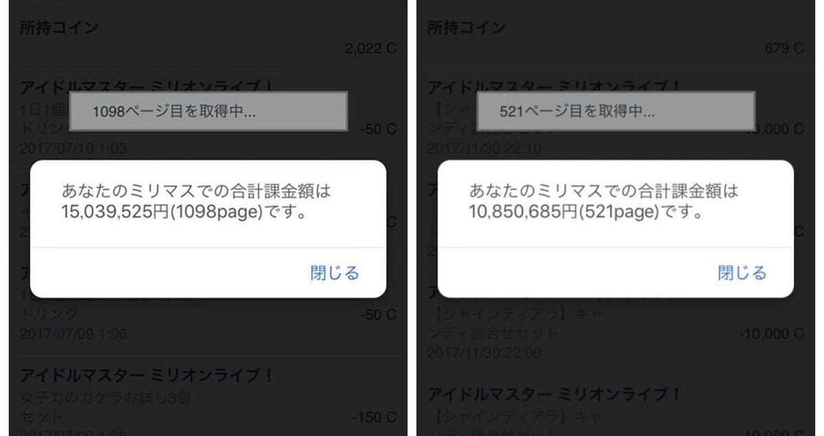 這兩名玩家全部都是《偶像大師Million Live!》的粉絲。其中最瘋狂的一名玩家網民叫做「ぐんぶす」,該玩家曬出了自己迄今為止課金的截圖,上面顯示數額達到了1500萬日元以上。