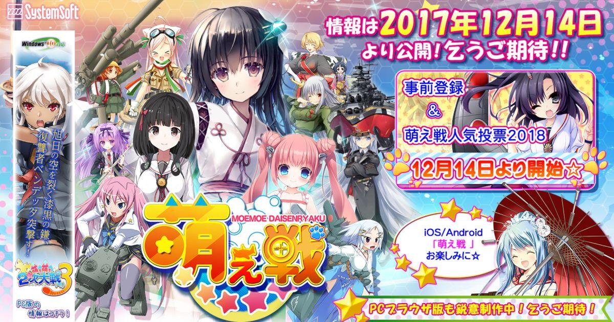 《萌戰》(萌え戦)是一款把第二次世界大戰活躍的海陸空的兵器都擬人化成可愛的少女的遊戲遊戲模式為模擬以及冒險的遊戲。而標題有著「MOEMOE DAISENRYAKU」寫著和同社的《萌萌2次大戰(略)》(萌え萌え2次大戦(略))有著相關性!而《萌戰》(萌え戦)預定2017年12月14日開放遊戲的事前登錄,有興趣的玩家可以留意!同時《萌戰》(萌え戦)會有PC網頁版,玩家亦可以期待!