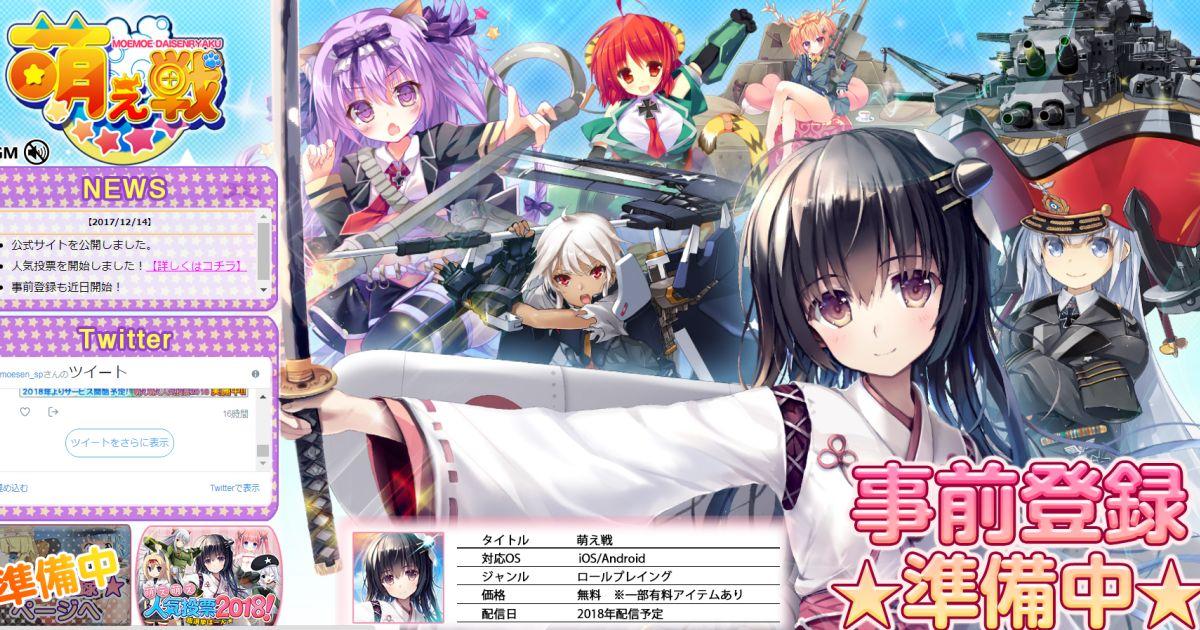 《萌戰》(萌え戦)是一款把第二次世界大戰活躍的海陸空的兵器都擬人化成可愛的少女的遊戲遊戲模式為模擬以及冒險的遊戲。而標題有著「MOEMOE DAISENRYAKU」寫著和同社的《萌萌2次大戰(略)》(萌え萌え2次大戦(略))有著相關性!而《萌戰》(萌え戦)原定2017年12月14日開放遊戲的事前登錄,但更改開放時間了,有興趣的玩家就要留意一下!而且官方開放了遊戲系列角色的人氣投票。《萌戰》(萌え戦)會有PC網頁版,玩家亦可以期待!