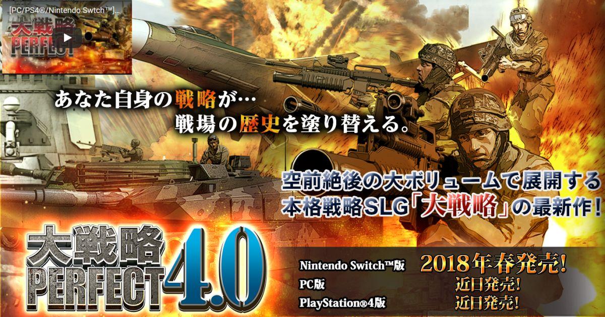 《大戰略PERFECT》則是遊戲系列的「完美版」現在的《大戰略PERFECT4.0》將會比前作更加完美!《大戰略PERFECT4.0》的PC版遊戲原定2018年1月26日發售,現更改自近日發售,而Nintendo Switch版遊戲原定2018年3月22日變更為2018年春季,有興趣的玩家就要留意了!