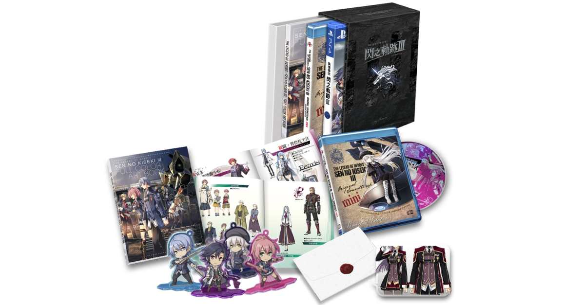 附贈內容 | ① 「英雄傳說 閃之軌跡Ⅲ」原聲輯mini -Limited Edition- 從遊戲使用樂曲中精選多首BGM收錄為「KISEKI BOX」特製版本的原聲輯! ② 《特務科‧Ⅶ班》Q版兩用壓克力鑰匙圈組(共4種) 選用本作主角《特務科‧Ⅶ班》級任教官黎恩以及悠娜、庫爾特、 ③ 「英雄傳說 閃之軌跡Ⅲ」特製128頁全彩美術畫冊 收藏各角色的形象插畫、聚焦特寫、概念圖、遊戲中頭像等, ④ 原創DLC「來自托爾茲總校的邀請函」 可讓《特務科‧Ⅶ班》 | |