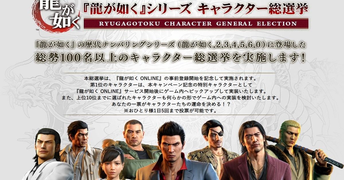 今次選舉的角色包括《人中之龍》、《人中之龍 2》、《人中之龍 3》、《人中之龍 4 說的繼承者》、《人中之龍5 夢 實踐者》、《人中之龍6 生命詩篇。》、《人中之龍0 誓言的場所》中登場,包括主角們以至各種配角在內超過 100 名角色中選中玩家最喜歡的一位,粉絲們不要錯過機會投出自己最喜愛的角色了!