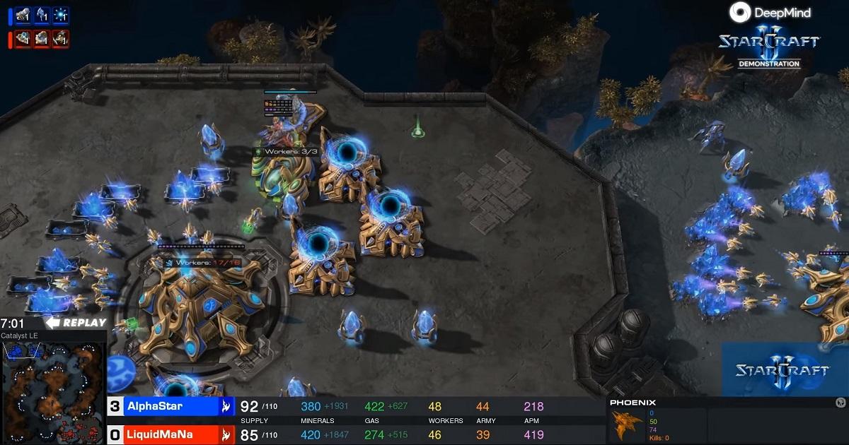 「AlphaStar」分別與《星海爭霸 2》的職業選手 TLO 與 MaNa 比賽,均以 5:0 的戰績大勝,「AlphaStar」展現出職業選手般成熟的比賽策略,以及超越職業選手水準的微操作,甚至可在地圖上多地點同時展開戰鬥,雖然「AlphaStar」的 APM(每分鐘平均操作量)不夠人類選手高,不過可以同時注意地圖上多眾多資訊,更有效操作單位進行戰術。