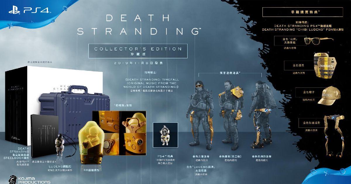 內容 | ·《DEATH STRANDING》製品版遊戲 · Steelbook鐵盒 ·金色「Ludens面具」太陽眼鏡(遊戲內使用)* ·《DEATH STRANDING: Timefall (Original Music from the World Of DEATH STRANDING)》 - 音樂專輯下載版及幕後花絮影片下載版 *於遊戲進行途中解鎖 |