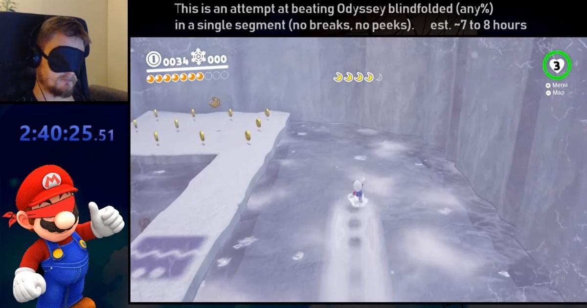 荷蘭玩家 Katun24 常以蒙眼的方式來挑戰遊戲,最近他就以蒙眼的方式挑戰《超級瑪利歐 奧德賽》,成功以 5 小時 24 分 18 秒,不休息不除下眼罩的情況下,一次過打爆機並創下世界記錄,不少玩家對他的創舉表示驚訝。