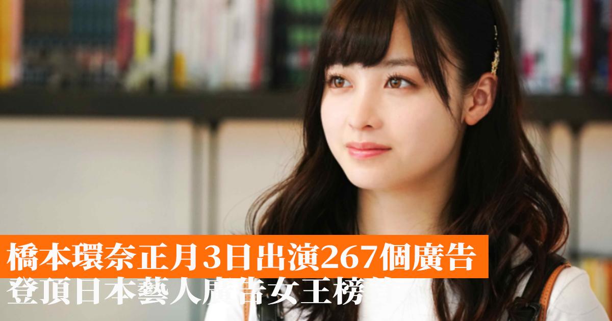 據統計,1月1日~3日這3天,橋本環奈出演了多達267個廣告,總時長達到4395秒,幾乎一開電視全是她;排名第二的是偶像組合桃色幸運草Z,出演了228個廣告;第三位是資深演員大泉洋,為205個。