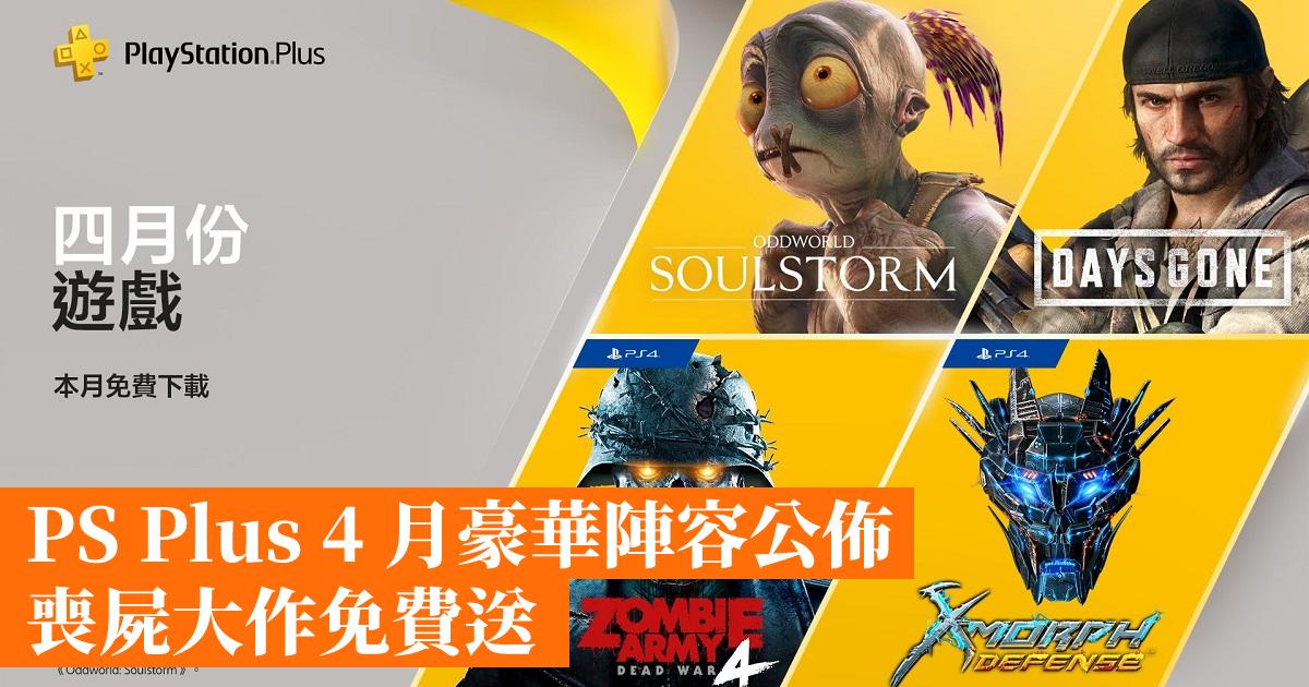 SIE 宣佈 PlayStation Plus 四月份會員免費遊戲將於 4 月 6 日開始至 5 月 5 日期間推出,包括送出 PS4 遊戲《Days Gone》、《Zombie Army 4: Dead War》、《X-Morph: Defense》以及 PS5 遊戲《Oddworld: Soulstorm》合作 4 款作品。