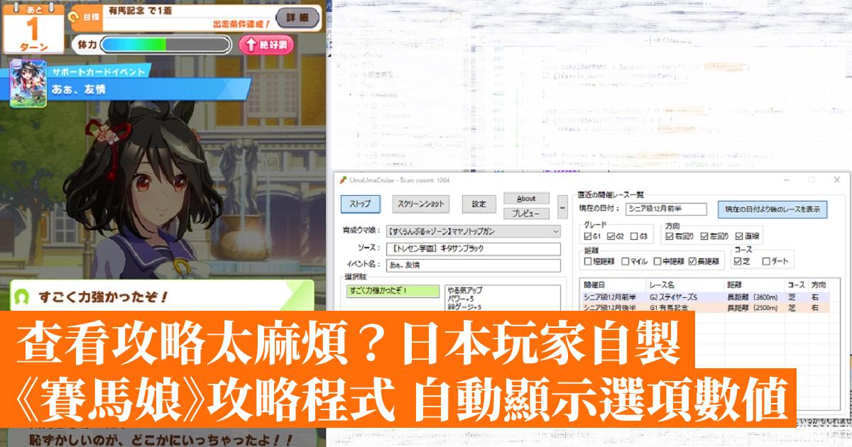 日本玩家 amate 就為此製作了一個 PC DMM 版的《賽馬娘》攻略程式,玩家可以使用攻略程式自動連結 DMM 版《賽馬娘》,展示現在正育成中的馬娘選項加乘數值,讓玩家們無需每次都到攻略網站查看。