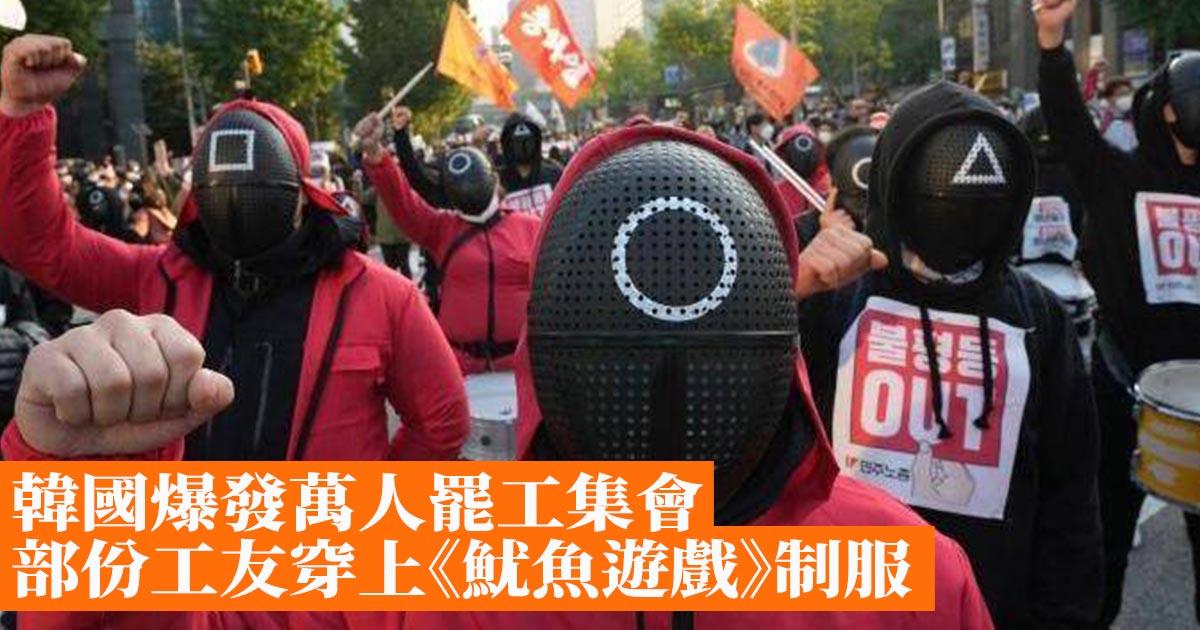 韓國爆發萬人罷工集會 部份工友穿上《魷魚遊戲》制服