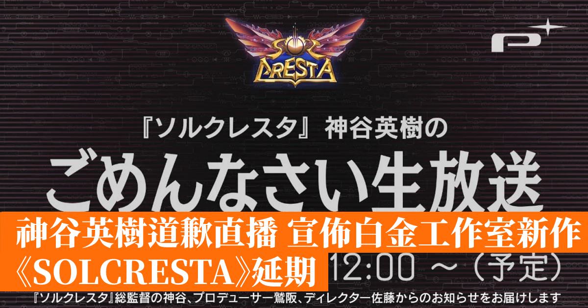 神谷英樹親自宣佈白金工作室開發的全新飛機合體射擊遊戲《SOLCRESTA》將會延期發售,由原定 2021 年 12 月 9 日改為 2022 年內。神谷英樹表示為了遊戲進一步提升質素,並加入一些新元素,並希望「比起死守發售日期,更希望提升遊戲品質」而作出今次延期的決定,新發售日預定會在新年左右時間發表。