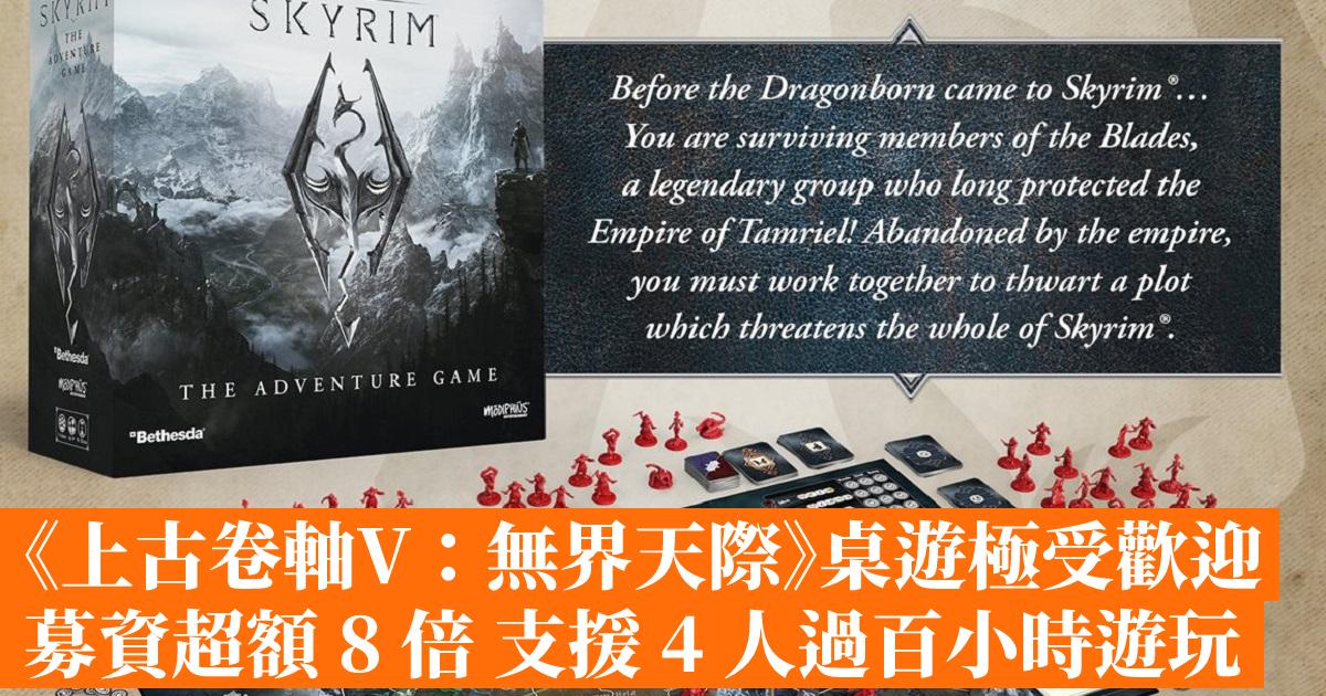 「The Elder Scrolls V: Skyrim The Adventure Game」以遊戲《上古卷軸V:無界天際》為背景,並以遊戲中的泰姆瑞爾帝國北方的無界天際省作舞台,玩家可以在 6 大勢力中選擇,在冒險中獲得技能、武器、裝備卡讓自己的角色成長,遊戲支援最多 4 人遊玩,每章預計 90-180 分鐘,共有 3 個章節以及 2 個故事劇情可以選擇,而且每一章會因玩家的選擇而改變。