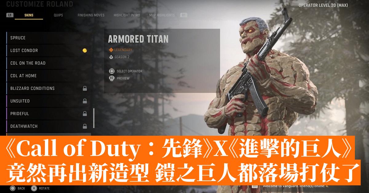 情報帳戶 CharlieIntel 於 Twitter 上發表,《Call of Duty:先鋒》與《進擊的巨人》尚未完結,並將會在最新一次更新中加入「鎧之巨人」的新皮膚外觀,還有專屬的步槍皮膚。組合包將會在《Call of Duty:先鋒》與《現代戰域》中登場。