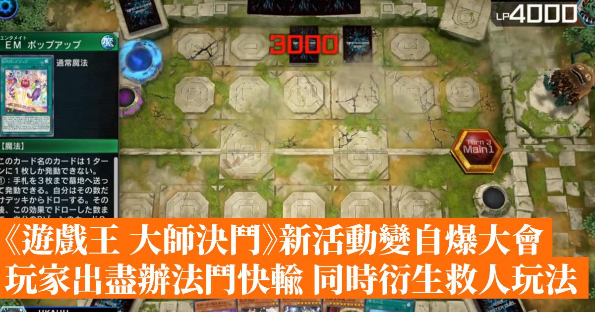昨天《遊戲王 大師決鬥》開始了新活動「超量盃」,玩家們可以按分數來入手各種獎勵,不過官方為了輸的玩家也可以獲得獎勵,所以設定為贏的玩家可獲 100 分,輸的玩家也能獲 50 分,不過玩家們為求快速刷分,卻演變成為自爆大會!