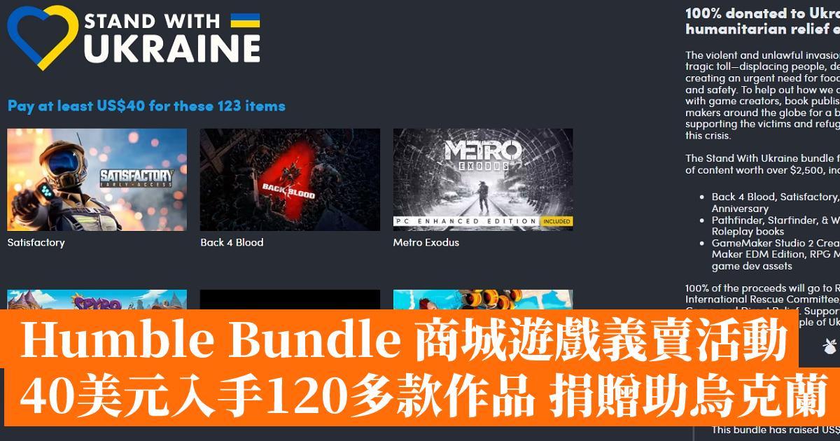 Stand With Ukraine 捆綁包包含 120 多款遊戲與 DLC 價值超過 2,500 美元的內容,包括《喋血復仇》、《Satisfactory》、《戰慄深隧:流亡》等遊戲,亦包括《RPG Maker VX》等開發工具以及一些電子書籍。
