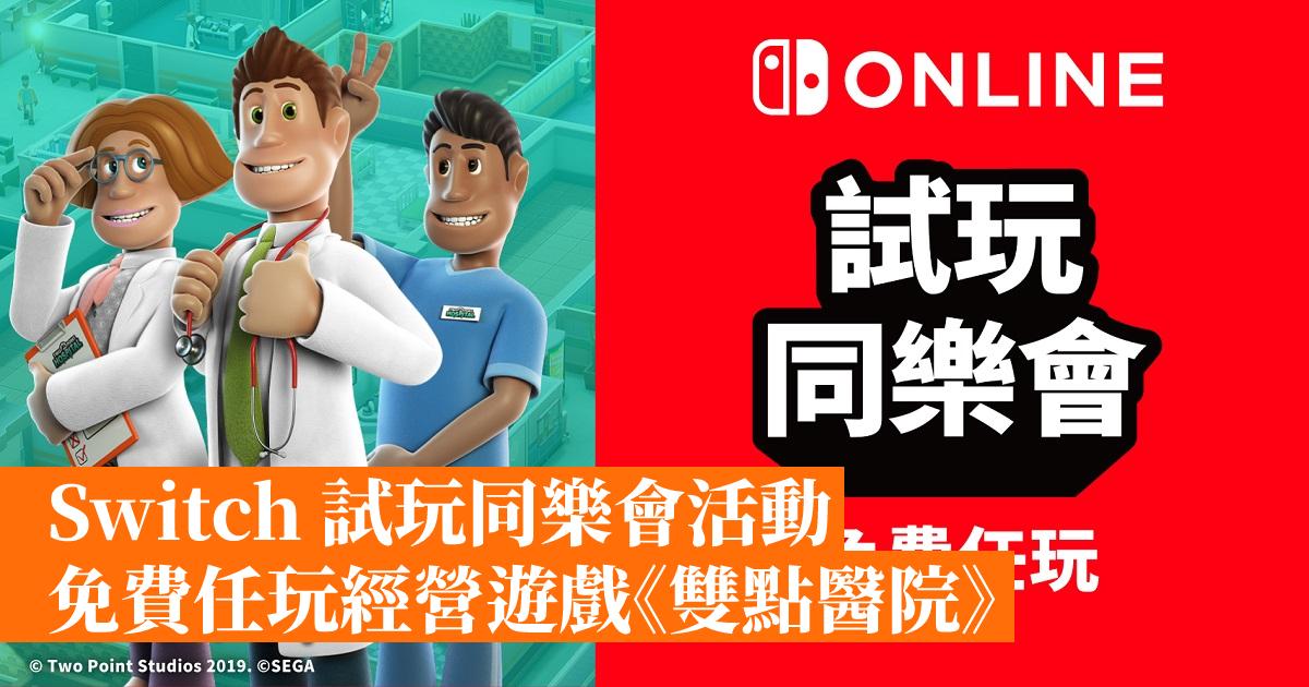 Nintendo Switch Online 加入者限定活動「試玩同樂會」今次指定遊戲軟體為《雙點醫院》(Two Point Hospital),在 2022年4月1日(五)12:00 ~ 4月7日(四)17:59 期間,玩家可以免費任玩本作。