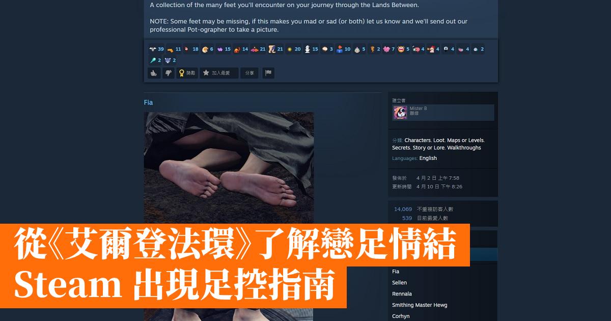 近日 Steam 的《艾爾登法環》遊戲指南中,出現一個由玩家 Mister B 發表的「The Many Feet of The Lands Between」更衝上了近日熱門關注榜,這個指南竟然是一個分享「戀足情結」的頁面!