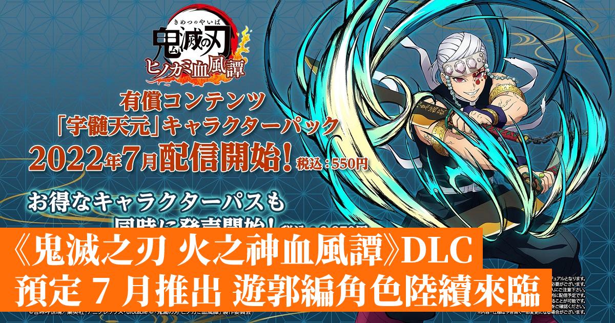 《鬼滅之刃 火之神血風譚》新 DLC 預定 7 月開始發佈,「遊郭編」登場的 5 位新角色即將來臨,第一彈登場角色為「宇髓天元」,單售 550 日元,角色通行證為 2970 日圓。另外,同日會推出免費更新,加入新場地「吉原遊郭」。
