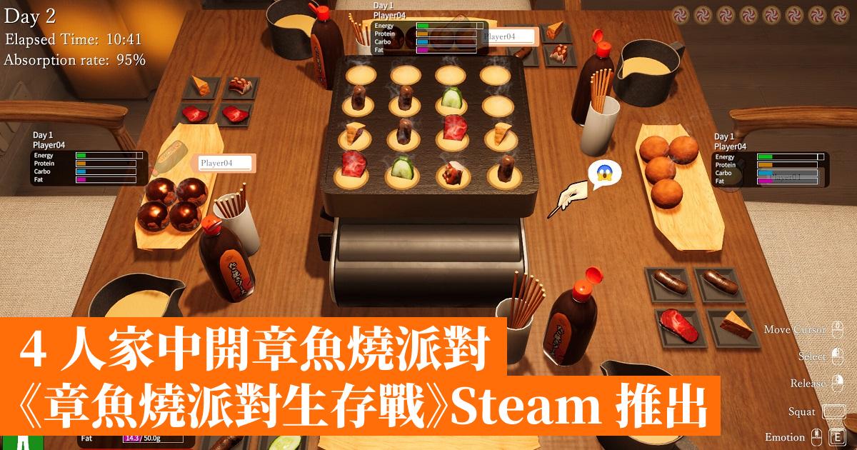《章魚燒派對生存戰》是一款以章魚燒派對為主題的對戰生存遊戲,玩家們需要在同一個章魚燒爐上一起製作章魚燒,並透過進食來維持蛋白質、碳水化合物和脂肪等營養,最多支援 4 人一起同枱開吃!