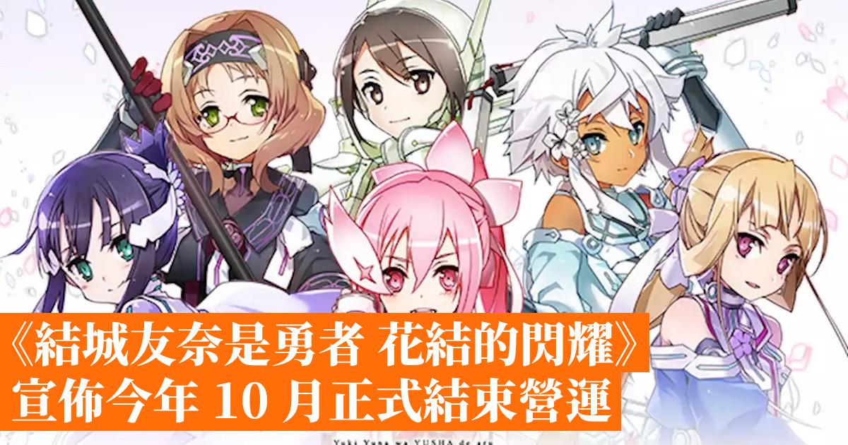 《結城友奈是勇者 花結的閃耀》決定將於 2022 年 10 月 28 日結束營運,預定 9 月 30 日起停止販賣課金道具「神樹的恩惠」,以及將於 9 月下旬推出「閃耀之章」的最終章更新。