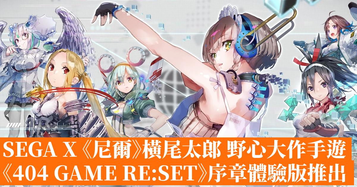 《404 GAME RE:SET -錯誤遊戲 Re:set-》是由橫尾太郎擔任創意總監,SEGA 開發的全新射擊風格 RPG 手機遊戲,故事講述 SEGA 稱霸了各項領域的巔峰,玩家遇見了神秘存在“X”並得知世界因為SEGA而扭曲了,為了找回原來的世界,決定參與這場與SEGA的戰鬥。
