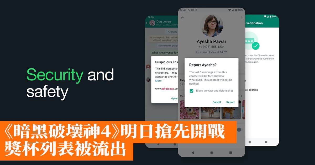WhatsApp現正式推出全新的安全中心(whatsapp.com/security),幫助用戶了解如何避免受到欺詐行為、垃圾訊息和滋擾訊息的影響,以下為八大安全功能及相關技術:
