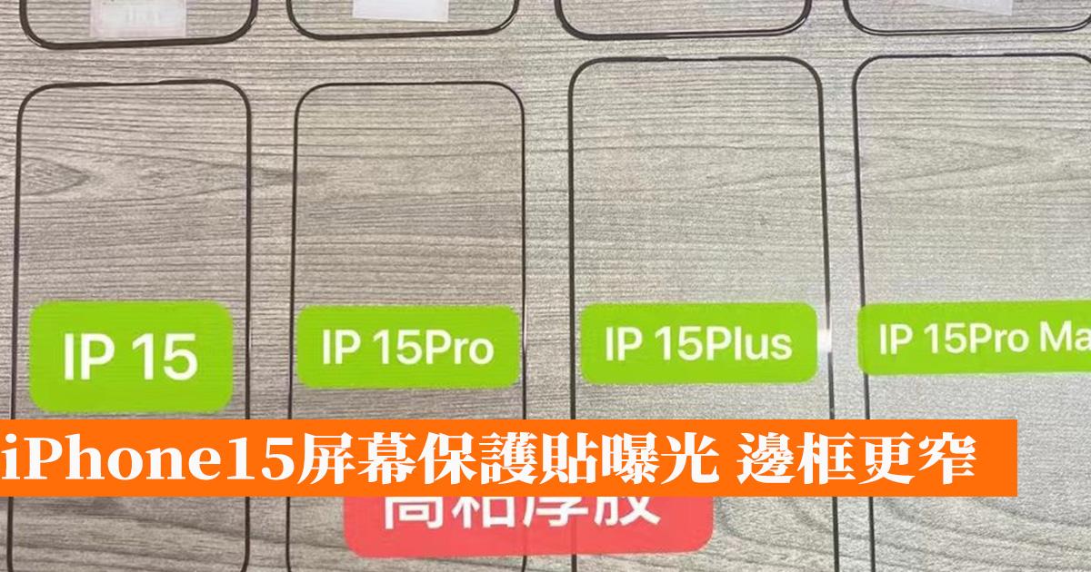 上方4張保護貼根據靈動島位置,應該為對應的iPhone14系列機型保護膜。從圖片中可以看到,邊框部分明顯收窄。據此前報導,iPhone15系列的外觀尺寸相比iPhone14系列基本不變,但邊框會更窄一些。