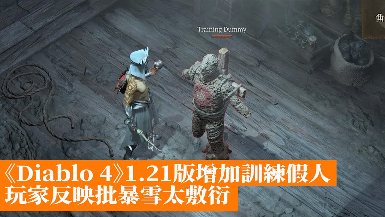 《Diablo 4》1.2.1版更新後中新增一個名為「訓練場」的地方。在訓練場中有五種類型的假人可供選擇,分別是普通訓練假人、菁英訓練假人、首領訓練假人、單一訓練假人、多個訓練假人。
