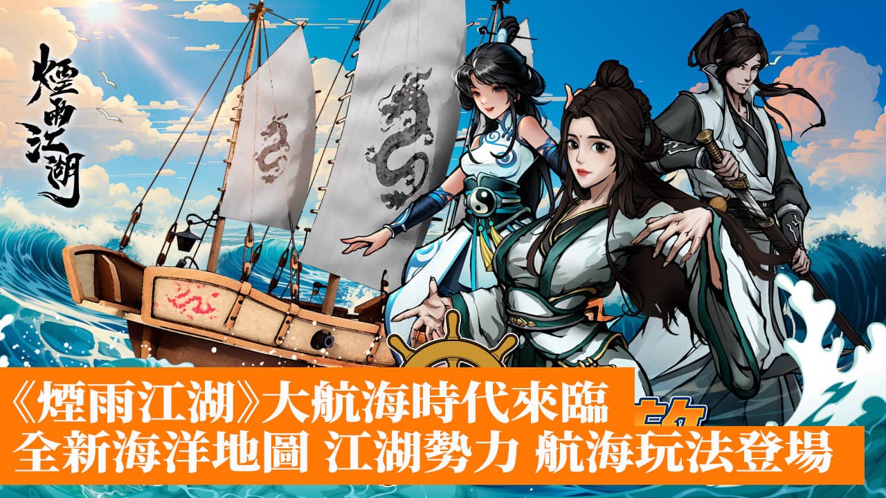 《煙雨江湖》首次推出海洋地圖,透過劇情任務解鎖的「航海玩法」,讓玩家可駕馭船隻遨遊東海,體驗刺激的海洋冒險。在航行的過程中,船隻提供多樣化的互動操作,如打撈寶藏、海釣、休憩、修理船隻等,這艘多功能船將成為征服東海的得力助手。然而,在尋寶的路上,玩家將面臨海賊、漩渦、礁石等危險,唯有少數勇猛的大俠能成功抵達「歸雲島」。