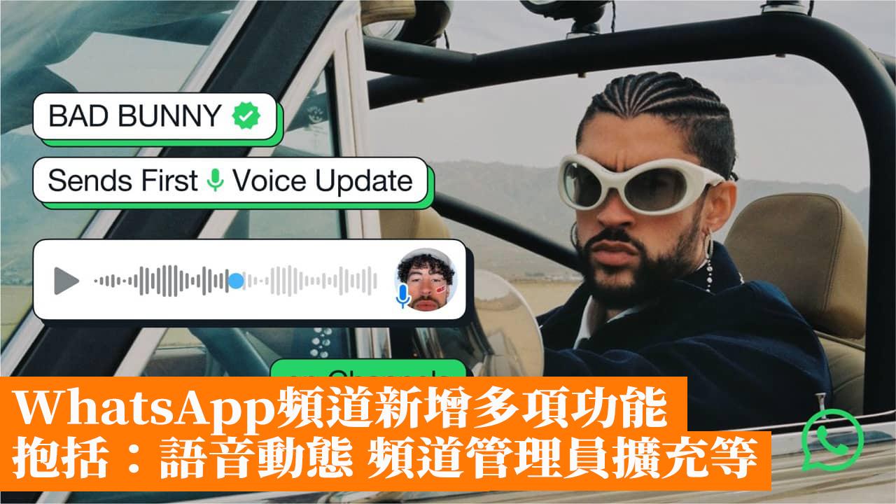 語音動態:頻道由即日起可使用語音形式發佈消息,外國歌手Bad Bunny 率先在昨日於其個人頻道內使用語音動態,而WhatsApp亦將陸續於更多地區推出此項功能