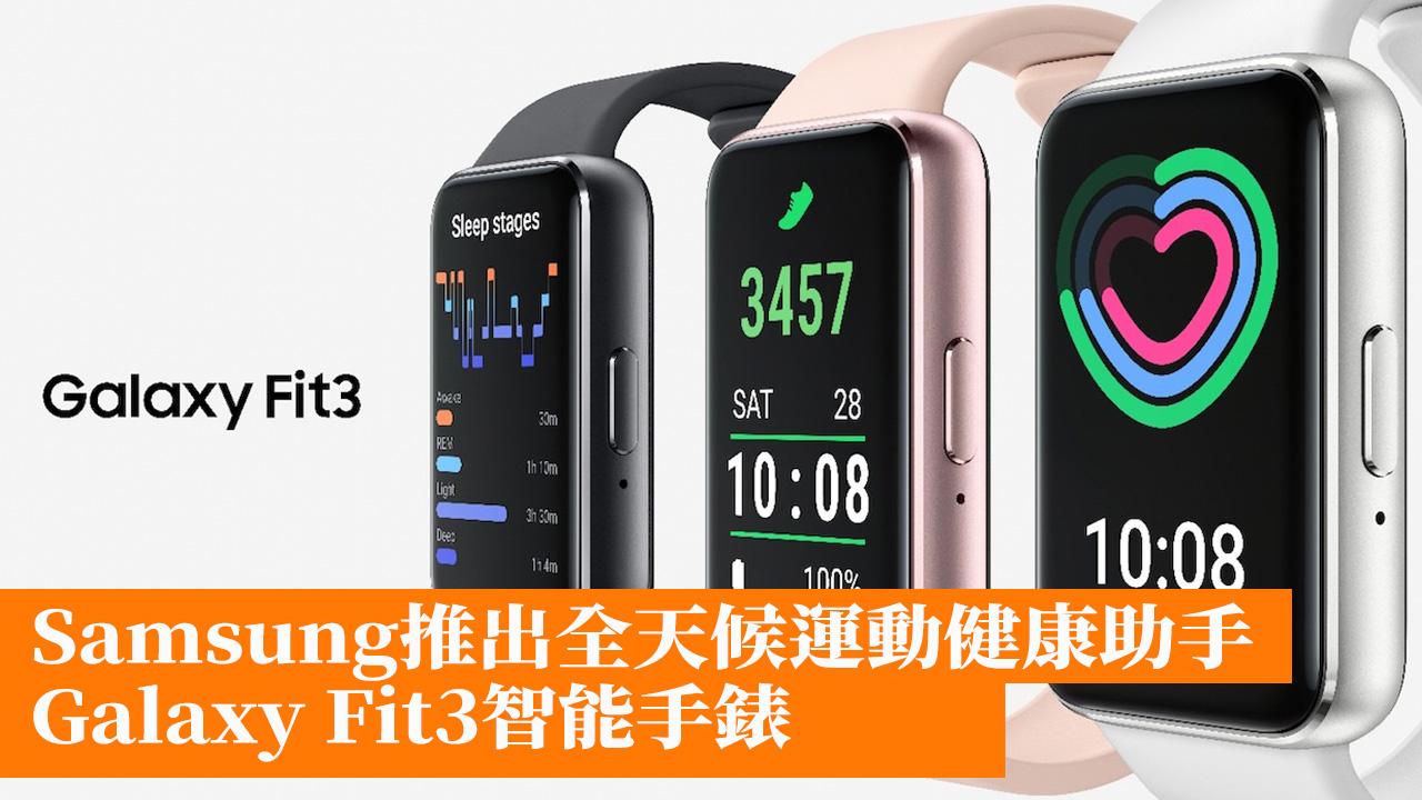 Galaxy Fit3以方便用戶日常生活為設計理念,採用1.6吋全彩色顯示屏,支援256 x 402解像度,清晰呈現內容。機身厚度僅為9.9mm,重量亦只有18.5g,帶來倍感舒適的佩戴感。時尚的錶帶配色,配合多款獨特錶面設計,讓用戶時刻展現個人風格。在鋁金屬的加持下,Galaxy Fit3比以往更堅固耐用,同時經5ATM以及IP68認證,用戶能夠無憂無慮地進行鍛鍊,盡情釋放活力。