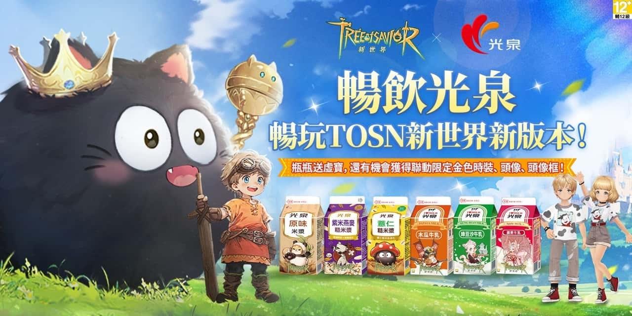 《救世者之樹:新世界》與光泉調味乳飲、光泉米漿火熱聯動中,勇者們可前往全台超商、量販、超市門市等各大通路,購買聯動限定包裝飲品,將有機會獲得聯動金色時裝、頭像、頭像框。同時,前往官方粉絲團參與加碼抽好禮活動,還有額外驚喜好禮!