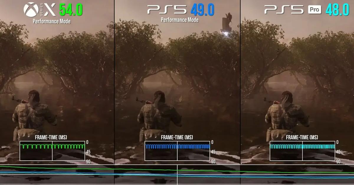 Digital Foundry 發佈了針對 Xbox Series X|S、PS5 與 PS5 Pro 的詳細分析。結果顯示,遊戲在三台主機上皆未能穩定輸出 60FPS,但 Xbox Series X 依然呈現最流暢的整體表現。在效能模式下,Series X 不僅提供更優秀的光影表現,動態解析度亦更高,能達到 1152p,而 PS5 則略降至 1080p。