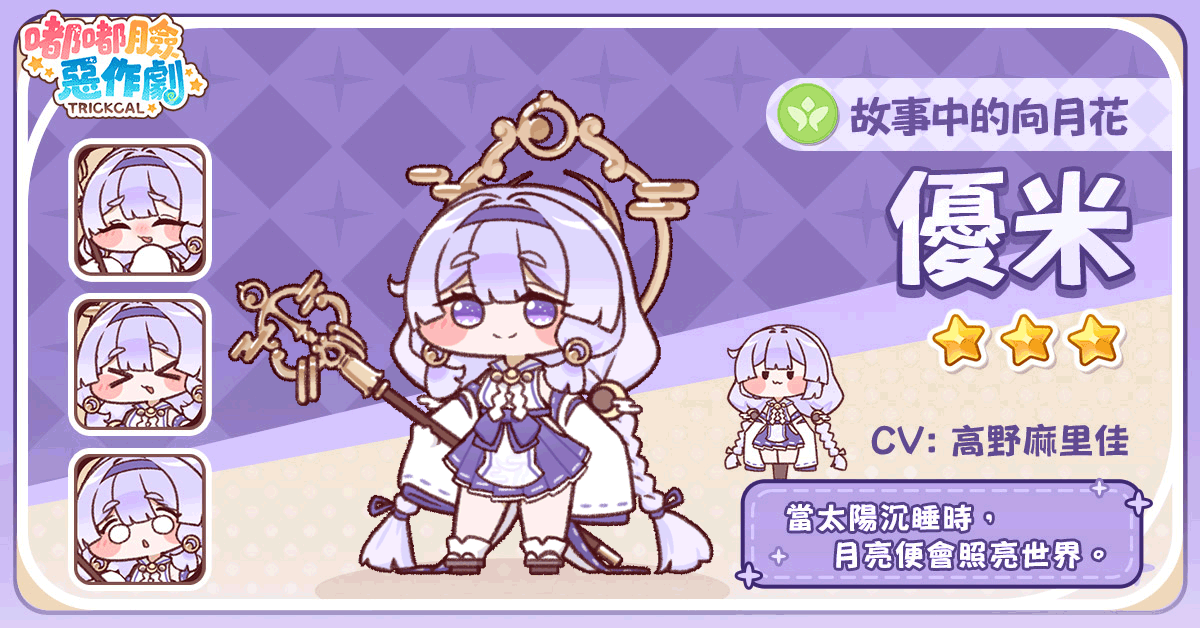 為此,官方特地邀請了日笠陽子(角色:綾)、高野麻里佳(國際服專屬角色:優米)、河瀬茉希(角色:優米)三位人氣聲優為角色配音,並共同演唱嘟嘟臉使者們的專屬洗腦主題曲,用可愛療癒的聲音及詞曲撫慰大家日常的疲憊,增添滿滿的正能量。