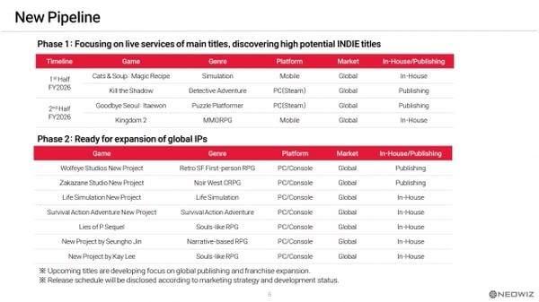 財報亦展示 NEOWIZ 2026 年後的整體產品線規劃。公司將以「階段 1」為基礎,強化旗下主力遊戲的營運,同時持續發掘具潛力的獨立作品,相關項目包括《殺死影子(Kill the Shadow)》與《追逐末日之光(Goodbye Seoul: Itaewon)》等。其後將邁向「階段 2」,全面推進全球化佈局。