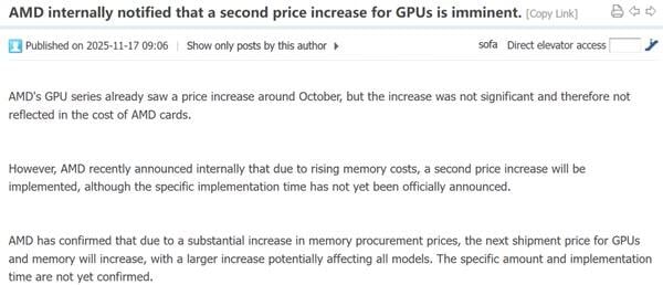 報告同時提及,漲價影響範圍包括所有 GPU 產品線,涵蓋 Radeon 消費級顯示卡、工作站顯示卡及 AI 解決方案。另一方面,根據先前消息,NVIDIA 亦在考慮於 2026 年初調整各系列 GPU 的價格,反映整個產業都將受到 DRAM 成本上升所牽動。
