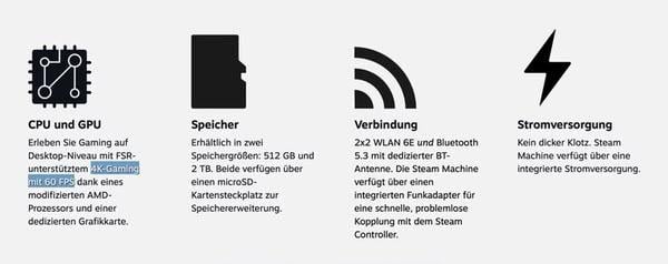 Steam Machine 主打比 Steam Deck 更高的遊戲性能,採用 AMD 標準晶片,理論上玩家亦能自行組裝類似規格的 PC。Valve 表示,新主機的效能超越 70% 參與 Steam 硬件調查的 PC,並擁有約六倍於 Steam Deck 的性能,在 4K 下搭配 FSR 升級技術即可達到 60fps。