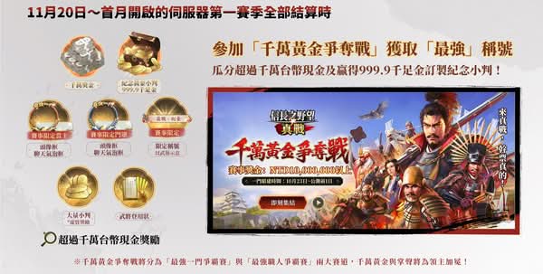 隨著《信長之野望 真戰》正式上線,千萬黃金爭奪戰也正式拉開序幕。本次賽事包括【最強一門爭霸賽】和【最強職人爭霸賽】,挑戰瓜分總獎金1000萬台幣、紀念黃金小判。上線首月的伺服器均能參與到本次賽事中,馬上下載遊戲,一起來爭奪千萬獎勵!除了賽事外,還有豐富的開服福利等著你來!