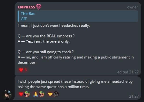 知名破解者EMPRESS近日被確認即將全面退出舞台。相關消息源自一張 Telegram 對話截圖,圖中她回覆名為「The Bat」的用戶,證實自己是真身,並表示將於 12 月發布公開聲明。