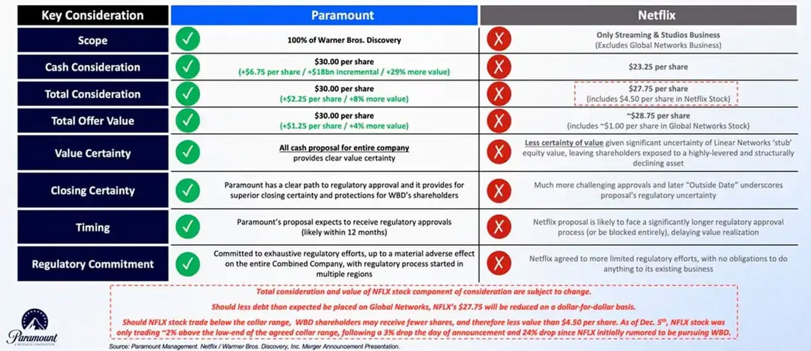 Paramount 提出的報價為每股 30 美元,全數以現金支付;範圍包括華納兄弟探索的電影與電視製作部門、Max 串流服務,以及其旗下的線性電視頻道。相比之下,Netflix 的報價為 27.75 美元,其中只有 23.25 美元為現金,其餘部分則以 Netflix 股票支付,並未涵蓋華納兄弟探索的全部資產。