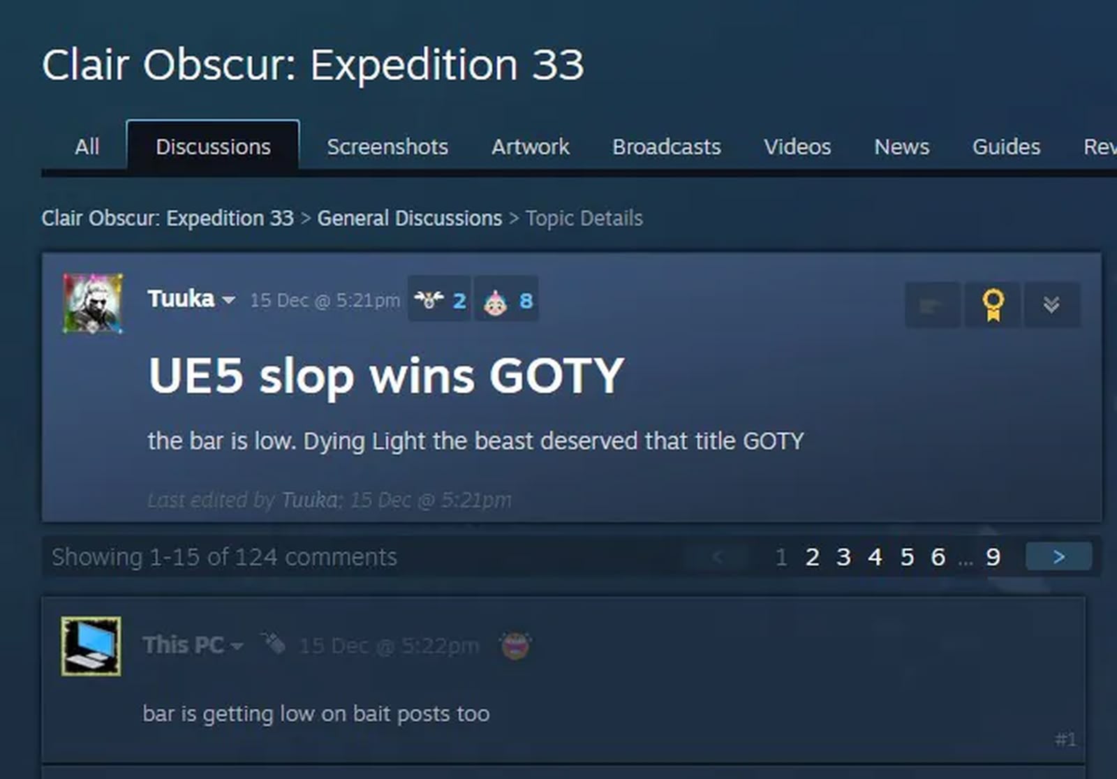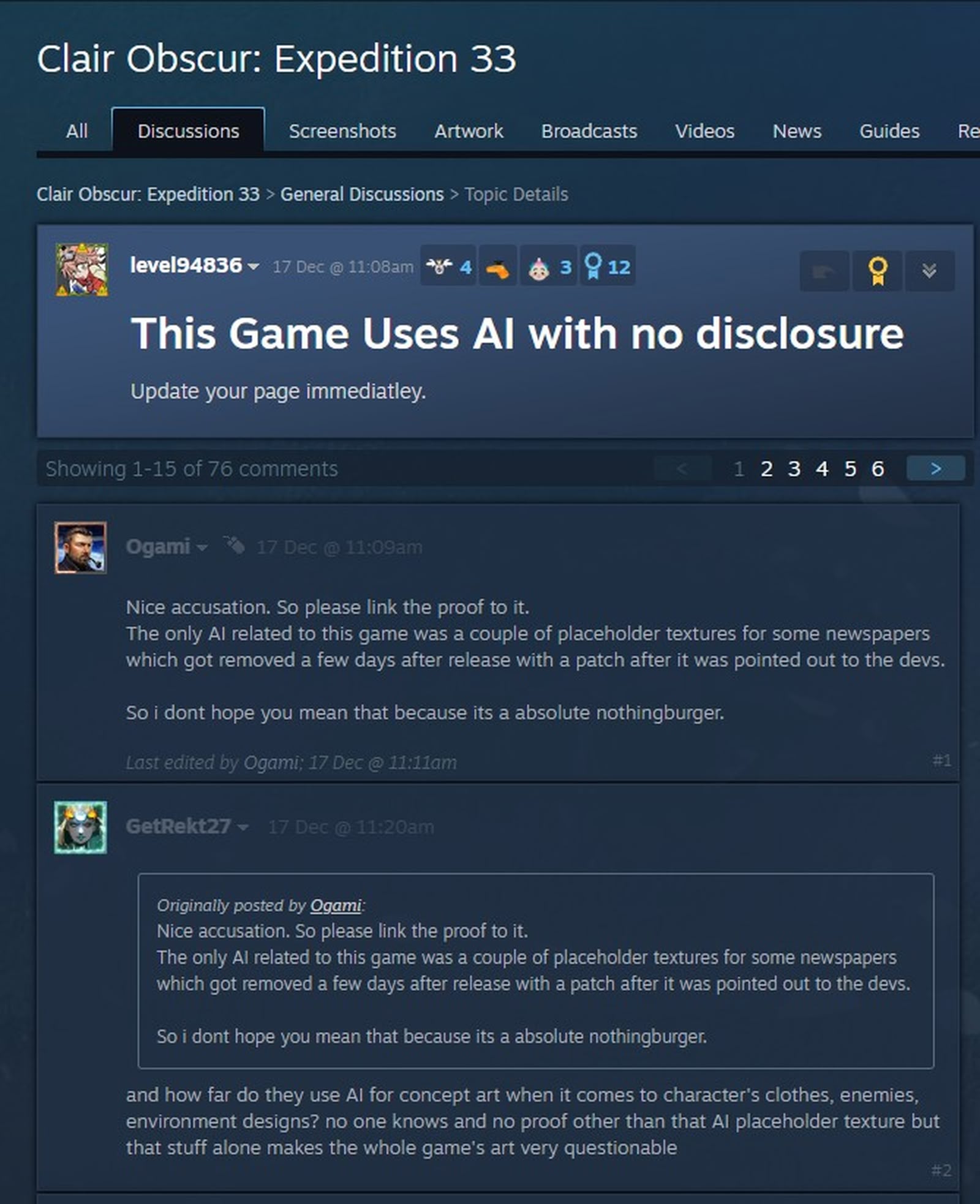 有玩家為《光與影:33號遠征隊》作出辯護,指出部分以生成式 AI 製作的素材其後已被全面替換為全手工製作內容,但仍認為事前披露資訊是較為妥當的做法。亦有意見指出,既然 Steam 要求必須標示 AI 使用情況,未有說明或屬不當,甚至可能引發下架風險。