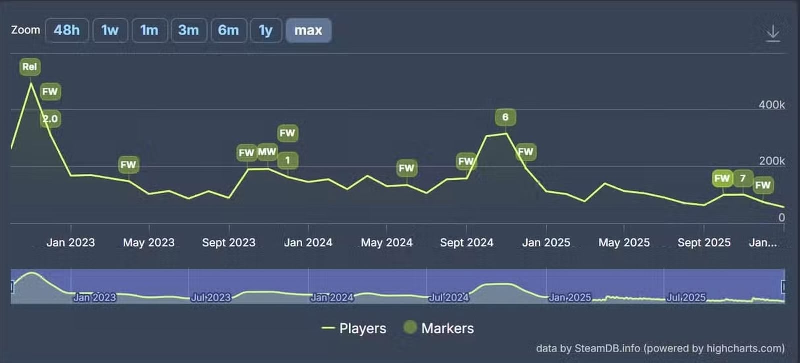 即使近期峰值略有回升,但整體走勢仍然持續向下,顯示自 2019 年以來,系列整體關注度已跌至新低。報道亦指出,即使未來季度更新理論上仍有機會帶來短期刺激,但在後續內容未能成功吸引玩家回流的情況下,前景並不樂觀。