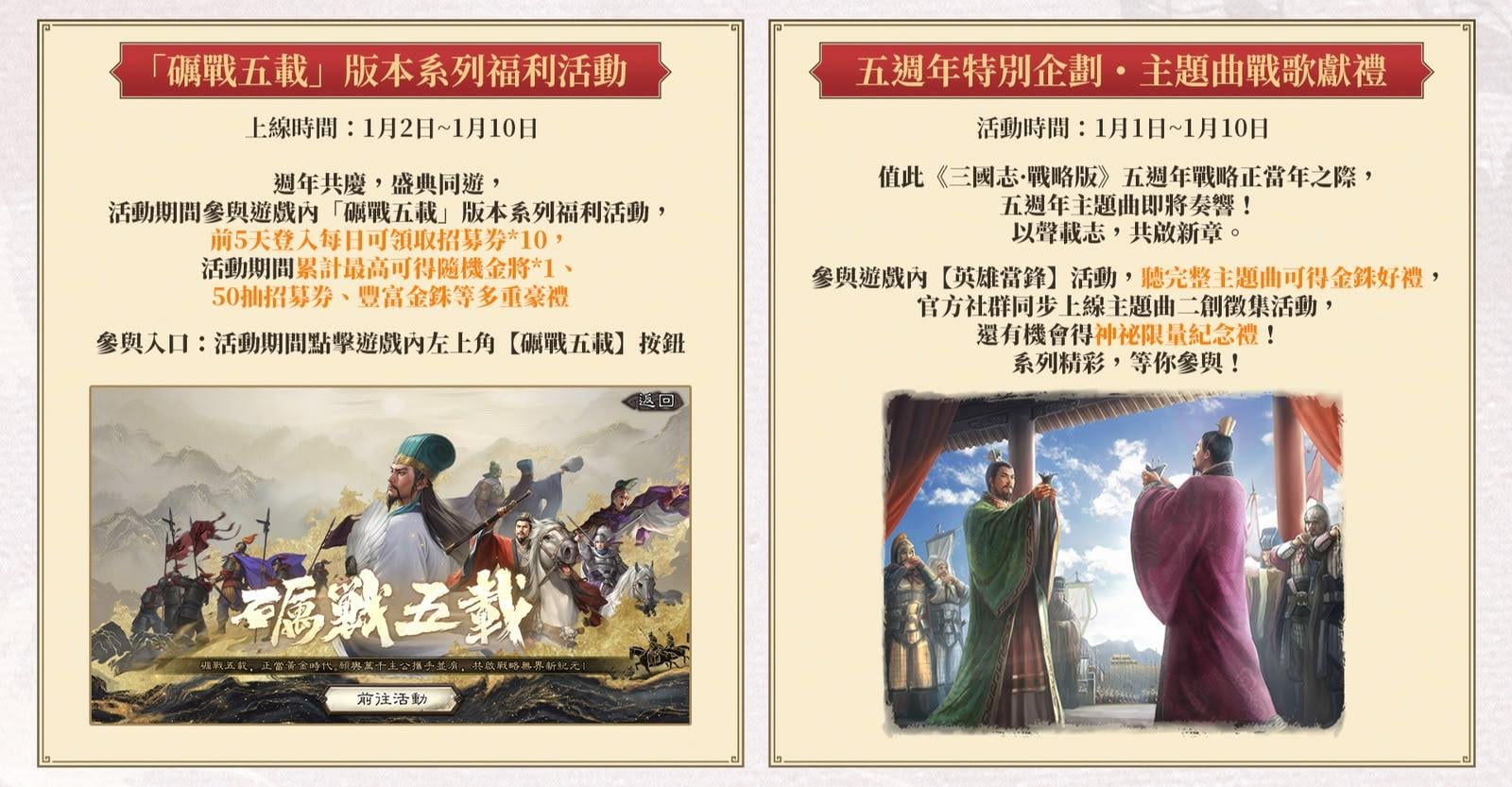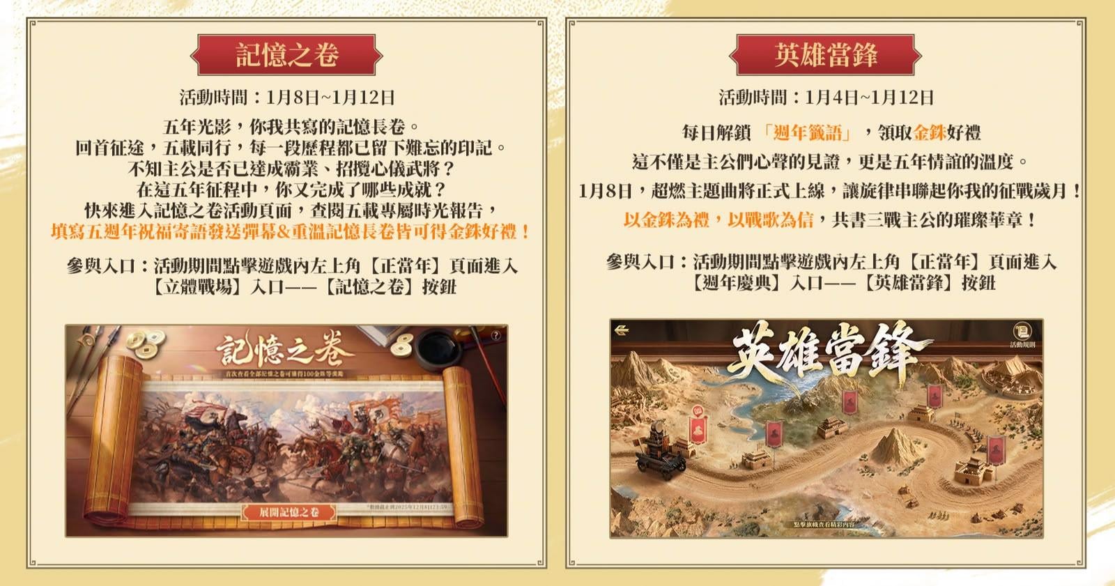 官方推出的「戰略‧正當年」版本系列福利活動目前正在火熱進行中。其中,玩家參與「礪戰五載」 活動累計最高可獲得隨機金將、招募券和金銖等多重好禮,享受豐厚的福利獎勵。而從1月8日開始,遊戲內還將推出「記憶之卷」專屬活動。玩家可以進入遊戲查看個人專屬的五週年時光報告,與其他玩家共同回顧在《三國志‧戰略版》中的熱血歲月,填寫五週年祝福寄語並發送彈幕留言,還可獲得金銖好禮。