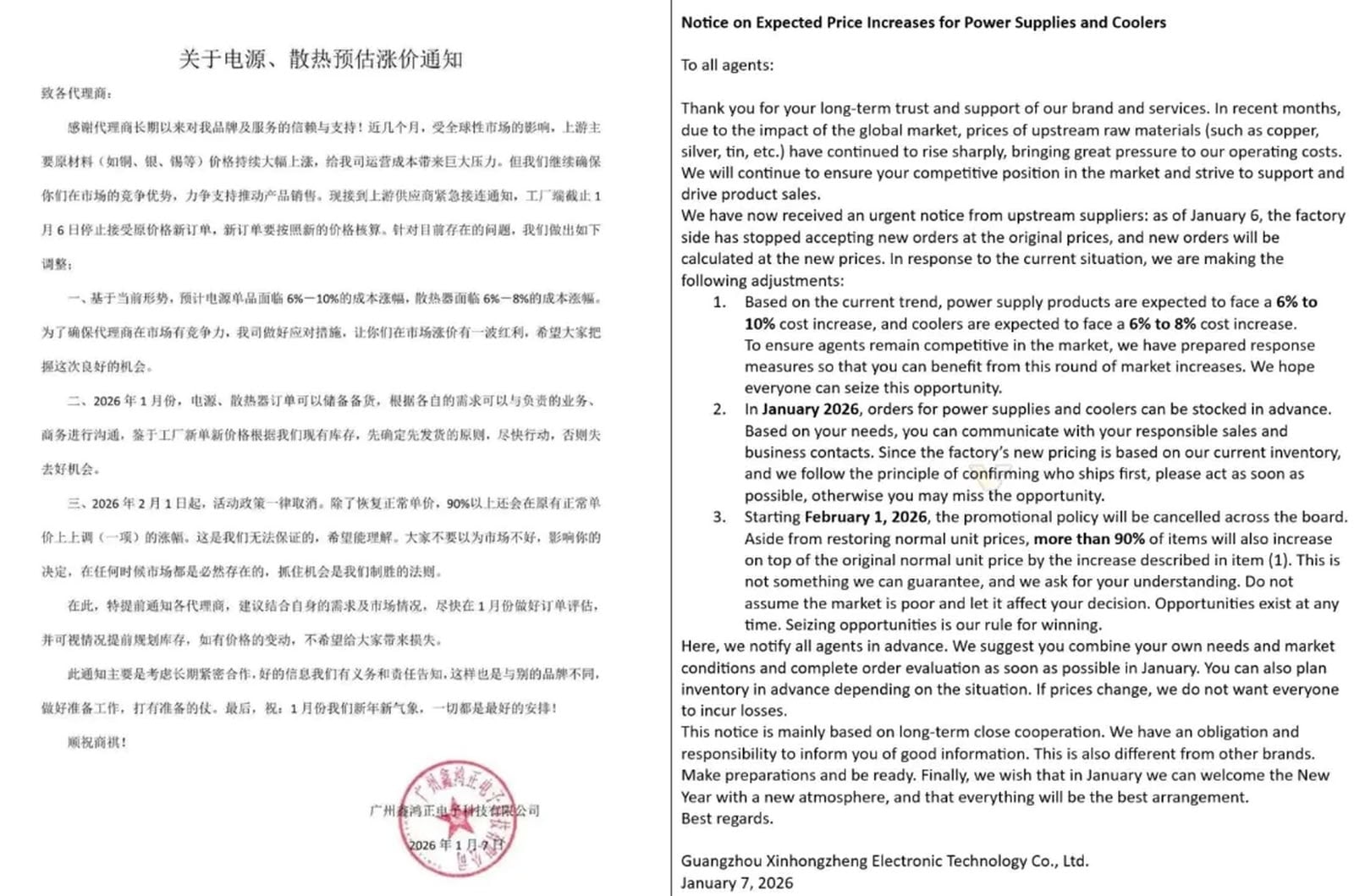 報告指出,有廠商已向合作夥伴發出通知,表示 PSU 價格將上調約 6% 至 10%,而 CPU 散熱器則會加價約 6% 至 8%。相關文件同時建議合作夥伴盡快下單,以避免未來承受更高成本。
