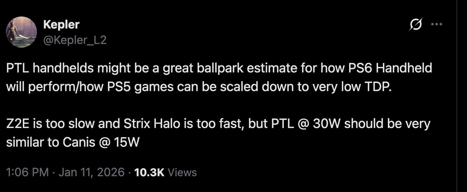 爆料者 Kepler_L2 表示,若將 PS6P 與現有 x86 手提遊戲機平台比較,搭載 AMD Ryzen Z2 Extreme 的 Strix Point 明顯偏弱,而 AMD 最新的 Strix Halo 則屬效能過強,反而是 Intel Panther Lake 成為較具參考價值的對象。