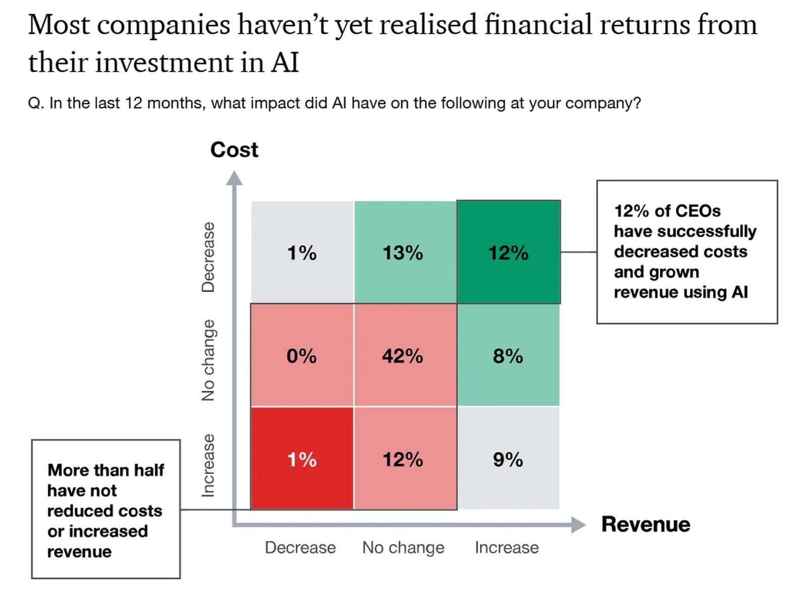 調查同時指出,僅 30% CEO 表示過去一年因 AI 帶來收入增長,而 26% 則認為 AI 有助降低營運成本。不過,能同時達成「收入上升」與「成本下降」兩項成果的企業僅佔 12%,遠低於外界普遍預期。