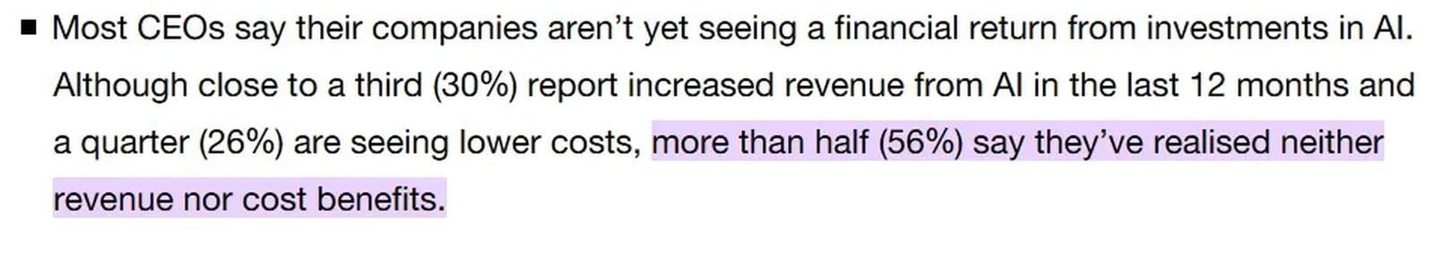 根據專業服務網絡 PwC 最新公布的全球 CEO 調查,該調查涵蓋來自 95 個國家、共 4,454 名企業行政總裁。結果顯示,多達 56% 受訪 CEO 表示,其公司在投資及採用 AI 後,至今未見任何財務收益。